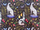 生地の地の色がブラック、動物の犬、ウサギは白と黒のモノトーン。果物のイチゴ、ナシは赤と黄色。葉の色は鮮やかなイエローグリーン。