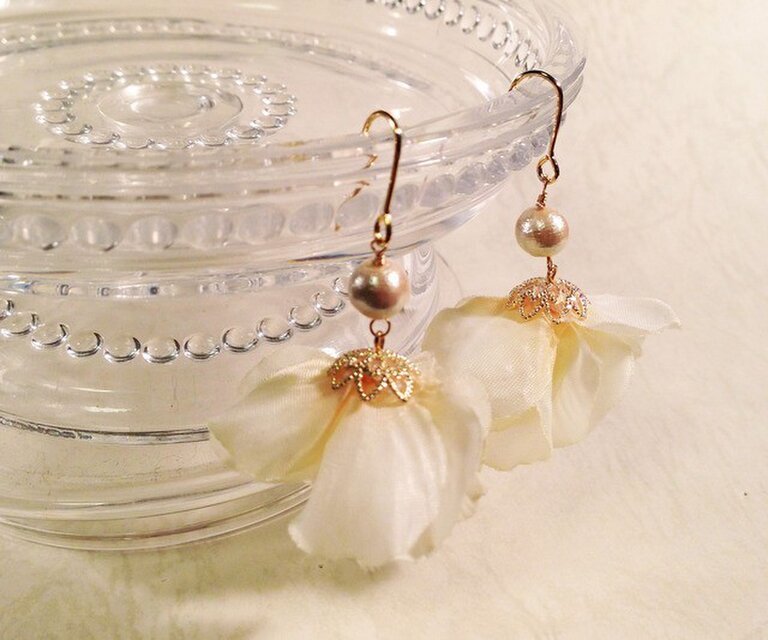 純白の花びらをギュッと集め、その上にコットンパールをあしらいました。