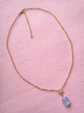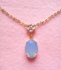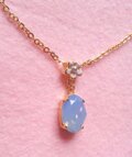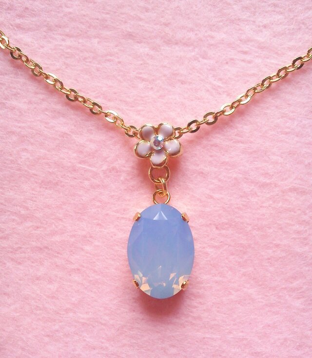 白い花と14×10㎜のオーバルカットのスワロフスキー(カラー:エアブルーオパール)を組み合わせたペンダントです。