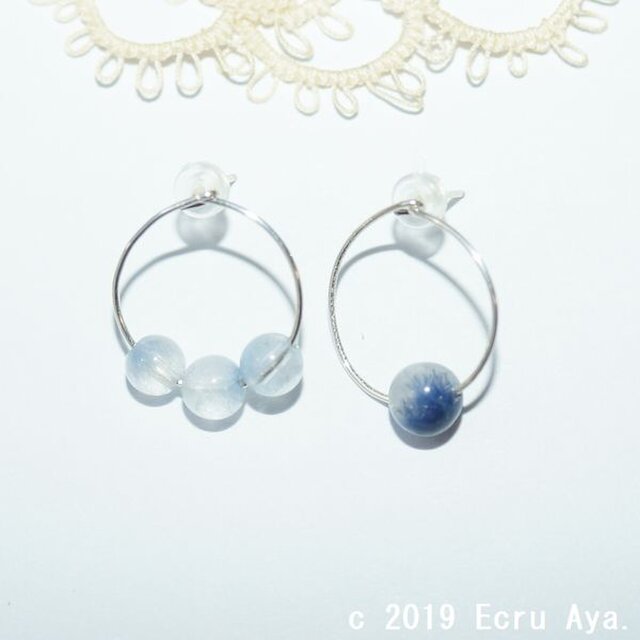 Sv925のワイヤーで、円を描くピアスパーツをお作りし、片方には6mmのラウンドを、もう片方には5mmのラウンドを3個通しました。