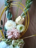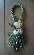 藁縄に柔らかな色合いのプリザーブドフラワーをリボンや飾りと組み合わせたハイセンスなしめ飾りが届きました。妻や娘もとても気に入ってくれました。 もういくつ寝ると・・・とお正月が待ち遠しくなります。 作品の他にThank youコメントのついた可愛らしいフラワーが添えられていたり、手書きのご挨拶が書かれていたりして、作品同様、作者様の温かい思いを感じる体験でした。ありがとうございました。