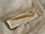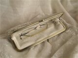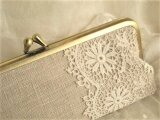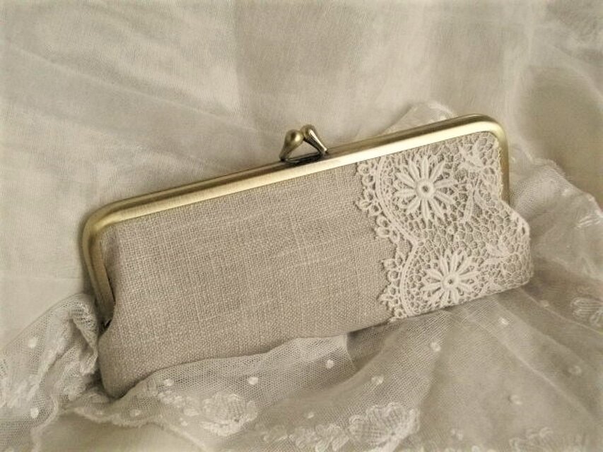 ナチュラルな雰囲気のエクリュリネンにアンティークレースをのせたがま口ペンケース