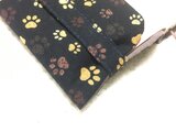 猫好きの友人が見つけてくれた生地で、文庫本カバーを作りました。2cmほどの濃淡の肉球模様がシックな色合いで描かれています。