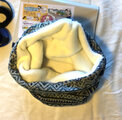表地は、うっとり素敵なノルディツクジャガード ブルー。ウールではないので暖かさには欠けますが、裏生地にマイクロパウダーフリース生地を使用しているので、ふわふわ・しっとり気持ちよく、暖かいです。