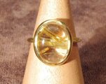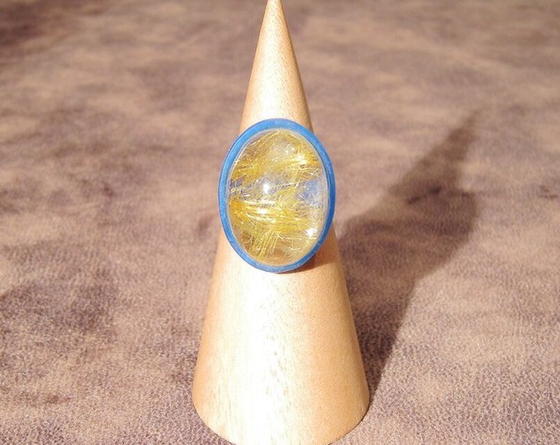 明るい金色の針が高密度で入った、大粒のルチルクォーツの指輪です。透明度も高い、高品質のルチルクォーツを使っています。ロストワックス(専用のロウで枠の原型を作り、その形通りに鋳造する製法)で、SV925製のオリジナルの枠を作り、ルチルクォーツをふくりん留めします。