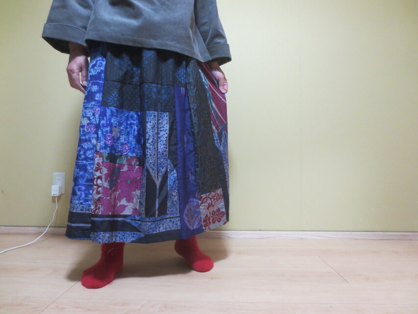 着物リメイク☆銘仙やアンティークの大島紬集めて集めて楽しくパッチスカート79㎝丈