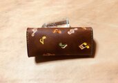 こちらの商品はヌメ革にひと手間かけ、♬♪柄のツールで、とんとん叩いてが茶色の染料で染色をした後、音符柄にも染色しています。