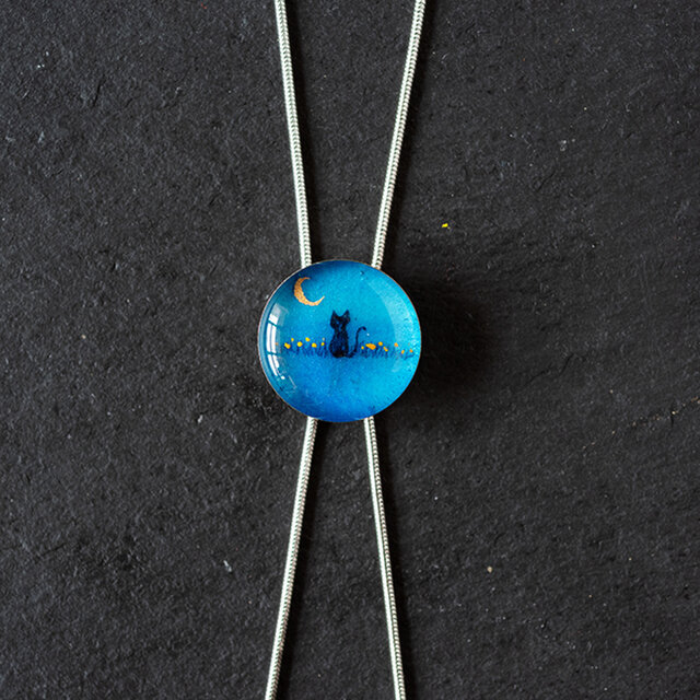 水辺の黒猫を描いたオリジナルイラスト(原画)をレジンでとじこめたループタイです。