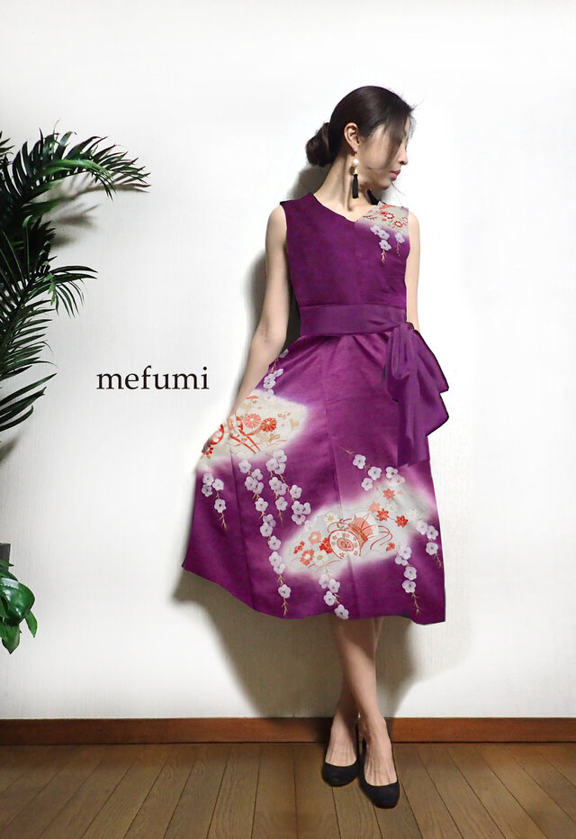繊細で美しく、上品な梅紫色に奏で長れる梅の花と御所車が上質な優美さを加味しだす、素敵なアンティーク着物をほどいて、画像デザインのフォーマルワンピースをお作りいたします。