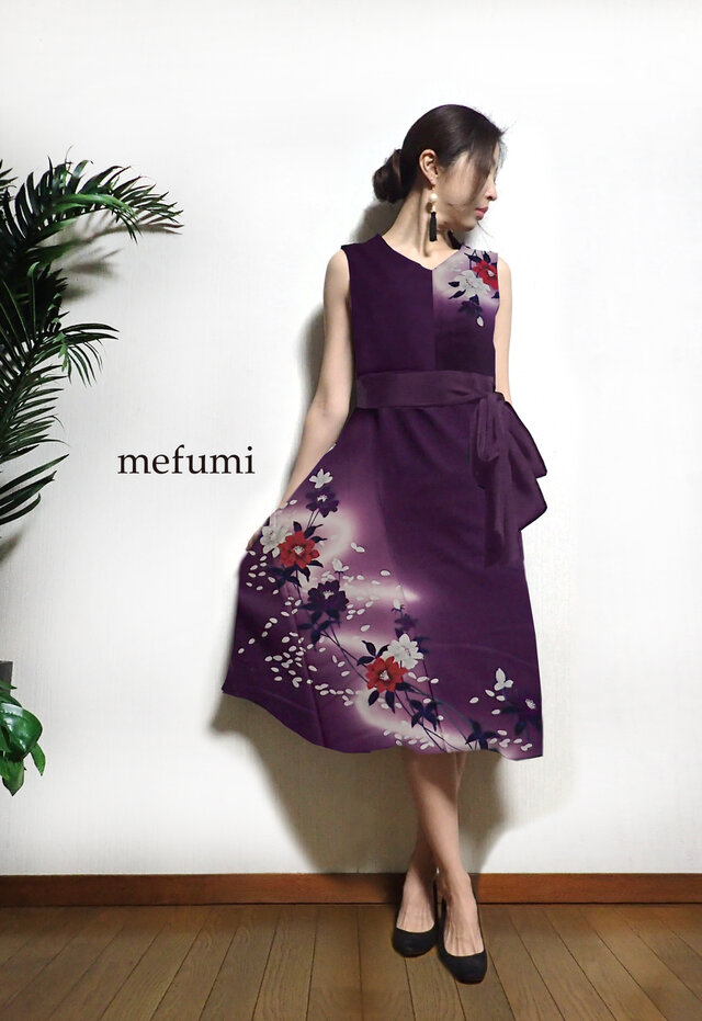 繊細で美しく、上品な紫紺色に奏で長れる華々が上質な優美さを加味しだす、素敵なアンティーク着物をほどいて、画像デザインのフォーマルワンピースをお作りいたします。
