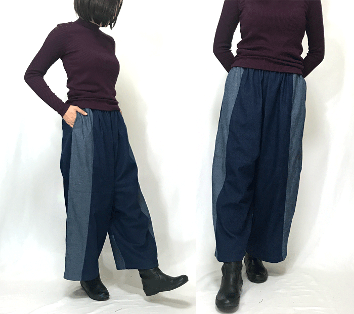 2色のソフトデニムを使ってバイカラ―(2色)切替のデザイン、体の中心に濃い色を持ってきて縦のラインが目立つようにしてあります。