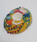 サーモンピンクの地に黒い花の刺繍、ありそうでなかったこの色のとりあわせ、すてきなブローチでした。