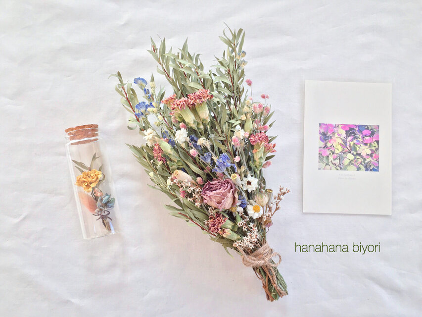お花の小瓶、そしてポストカード(1枚)の3点セットになります。
