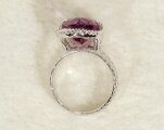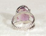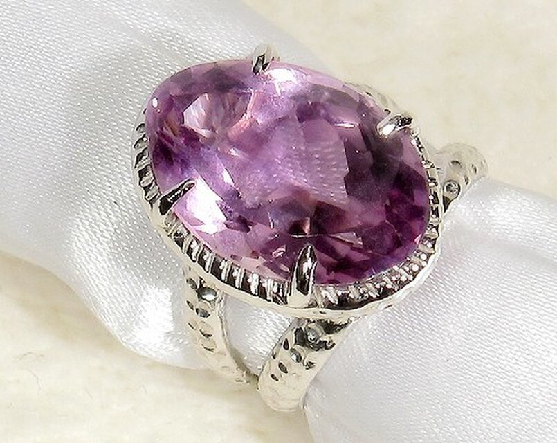 大粒のアメシストを使った指輪です。ロストワックス(専用のロウで枠の原型を作り、その形通りに鋳造する製法)で作った、オリジナルの枠を使っています。一つ一つ手作業でテクスチャを入れ、綺麗な輝きが出るようにデザインした枠です。
