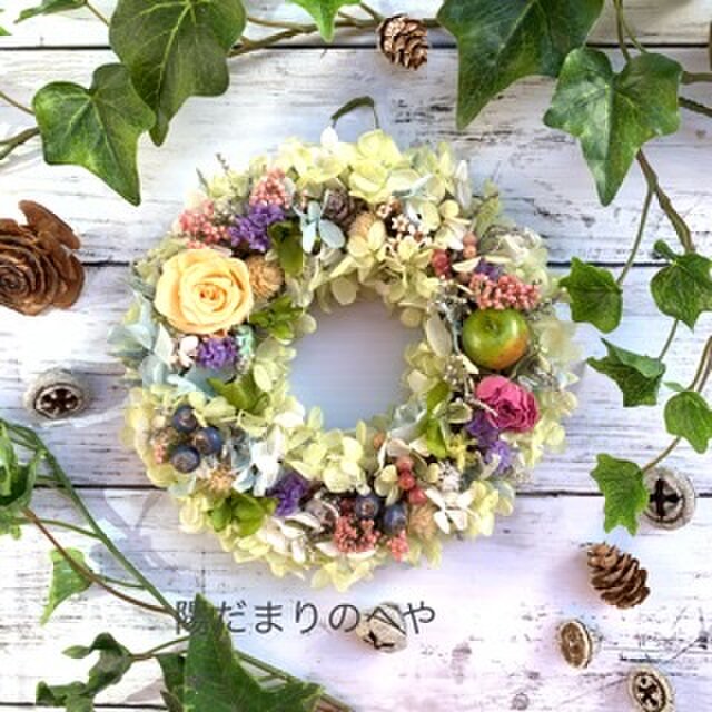 柔らかなオレンジカラーのプリザーブドのバラとグリーンアップル・ブルーベリーを組み合わせて、優しいお色のアジサイで包んだ春カラーのリースです。