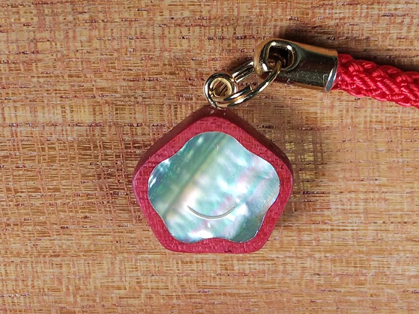 ピンクアイボリーという希少な木材にアワビ貝を象嵌(貝を糸鋸で切り取り、木地に彫り嵌め込む)してあります。