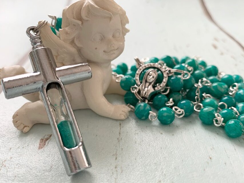 遅くなり大変申し訳ありませんm(_ _)m いつもとても素敵なロザリオをありがとうございます(*^^*)今回もセンターメダイと十字架と石のセンスがとても良くバランスが素敵です!大切にします。ありがとうございますまたよろしくおねがいします。