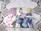ポケットティシュ入れの後側のポケットと折り返し側のポケット2つにナプキンやハンカチなど入れられます。二つ折りにして、くるみボタンに取り付けたゴムで閉じることができます。ゴムは少しきつめですのでポケットに厚めのものを入れた方が成形できます。ゴムはくるみボタンの穴に通して絡めているだけなので、すぐに外せますので(ゴムの金具の部分を引っ張れば外れます。)皮ひもに取り替えられます。皮ひもはくるみボタンの穴に通して真ん中で結ぶだけです。皮ひもを巻いて結ぶとまた別の表情になります。皮ひももサービスでお付けします。(ただ、利便性ではゴムの方が使い勝手がいいです。)