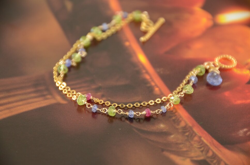 そんなことを思って制作したのが今回の作品です。美しい色とりどりの宝石たちと一緒にどんな時でも身に着けやすいそんなブレスレットにしてみました。