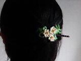 セットされた髪に飾りを当てて、かんざしを両脇の穴に通して固定します。