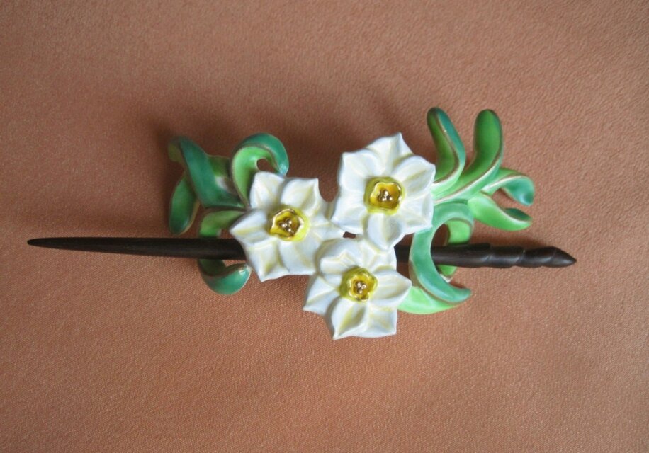 つげに水仙の彫刻をして、ウレタンで色を着けました。