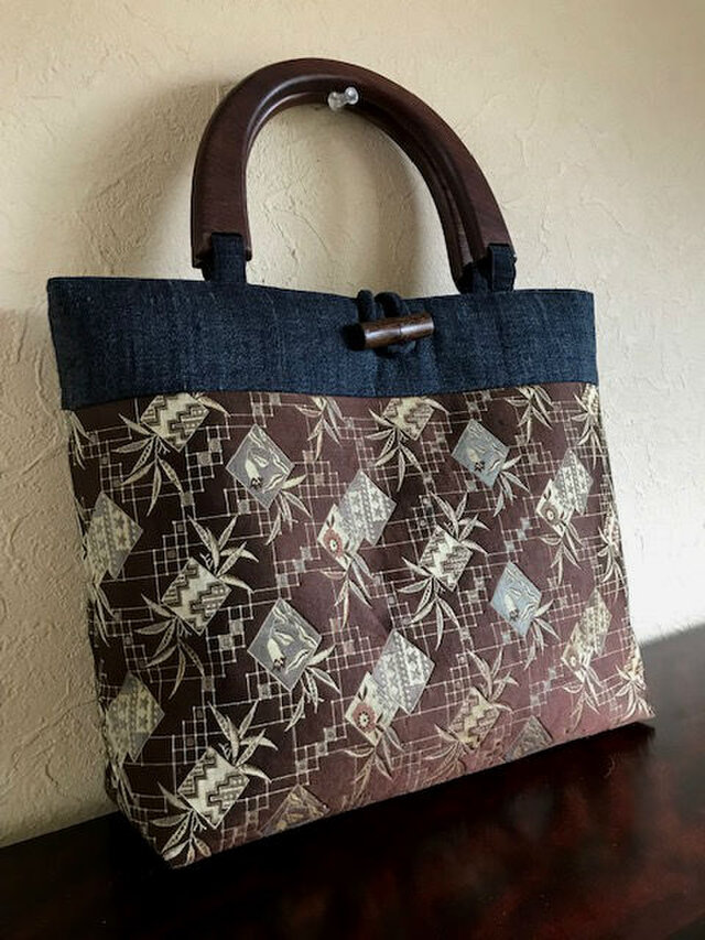 茶色をベースとした地に草花の柄の丸帯を手提げにしました。