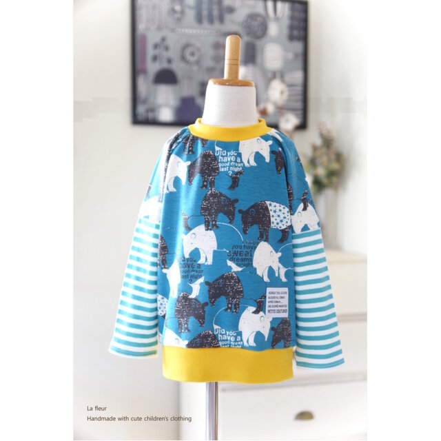 かわいいバク柄の天竺ニット(Tシャツ生地)とボーダーの接結ニット(カットソー生地)を合わせました♪