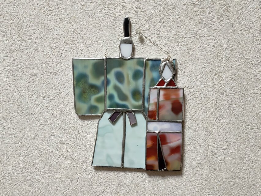 お雛様着物はのオセアナガラスの色の変化が面白い部分を使用しております。