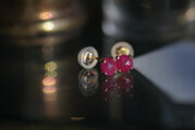 少しピンクがかった、妖艶で深い紅色が魅力的なルビーをシンプルにK10の石枠でピアスに仕立てました。