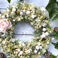 ブライダルピンクのプリザーブドのバラがポイントのグレイッシュカラーのリースです。
