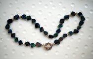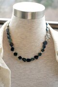 長さ10ミリ程度のちょうどいい大きさの石をシルク糸で結びながらつないで作ったネックレス、お色の面白さ、美しさを十分お楽しみいただけます。