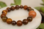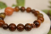 中心に15ミリの大きなムーカイト、中間色の美しい子です。10ミリのピーターサイトの間に8ミリのブロンザイト。最後に10ミリのタイガーズアイを組ませました。渋い色合いですが、勇気と信念、決断力を与えてくれる力強いブレスレットです。
