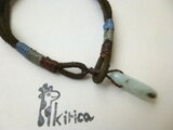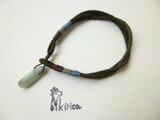 国産の革紐は、ダークグリーンとこげ茶の中間で、太目の3mm丸革紐。