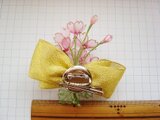 一足早く春の便りを届けてくれる河津桜です。濃い目のピンクが特徴で寒さに耐えながらも可憐に咲く姿が美しいです。そんな河津桜をアメリカンフラワーで作りました。これから迎える卒入学式のために,コサージュとしてもヘアアクセサリーとしてもお使いいただけるクリップ付のコサージュです。金色のリボンが桜を引き立てるアクセントになっています。和の雰囲気もありますのでお着物にも合うと思います。お花見の装いにもいかがでしょうか?