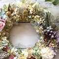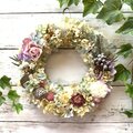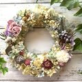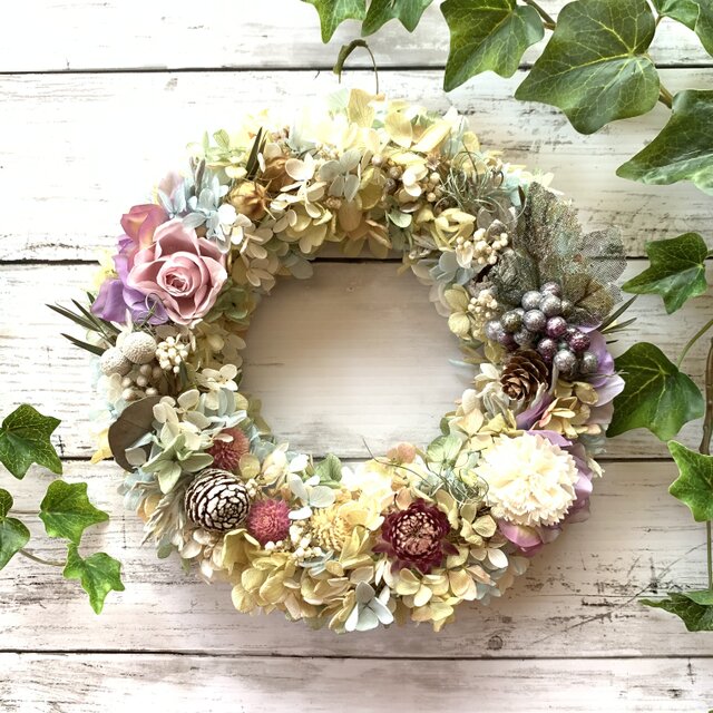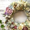 ペールライラックのバラとアーティフィシャルフラワーのブドウの葉っぱ・実を組み合わせたグレイッシュカラーのリースです。
