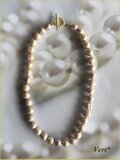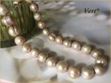 品の良いライトシャンパンベージュカラーの縞入りポテト淡水パールをひと粒ごとにベージュのナイロンコードで結び留めたオールノット仕立てのショートネックレスに仕上げました。こちらは1点のみの販売です。