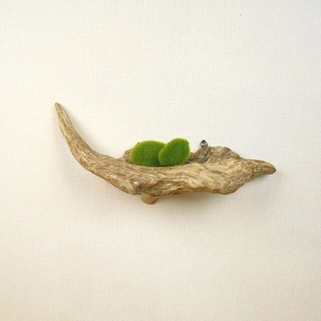 固定用の流木の足を付け加え、ブロンズ色の吊り金具を付け、壁掛けラックとして仕上げました。