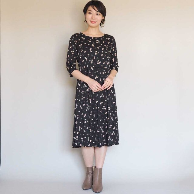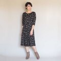・春夏は一枚で秋は重ね着で活用できる薄手生地。ストンと落ち感のある生地で、スカートは広がらず落ち着いた印象です。ブラックカラーが引き締まった印象で、ところどころに赤色がアクセントとして入っています。黒・赤・白の色の組み合わせがおしゃれな一枚。