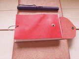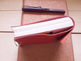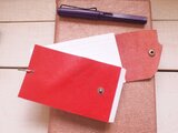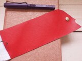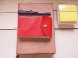と、元から厚手の紙なので立ちながら掌の上で書いてもくしゃっとなりませんが、分厚いわけではありませんが、しっかり芯の通ったレザーを選んで使っています。