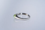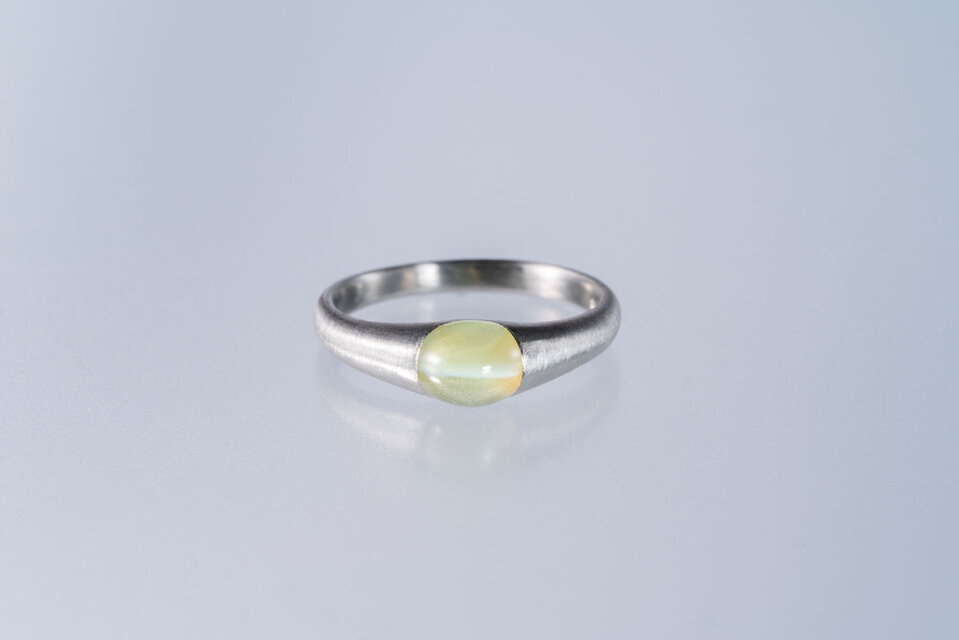 カヴォションカットの宝石が、リングと一体化するようにひっかかりなく留まっており、