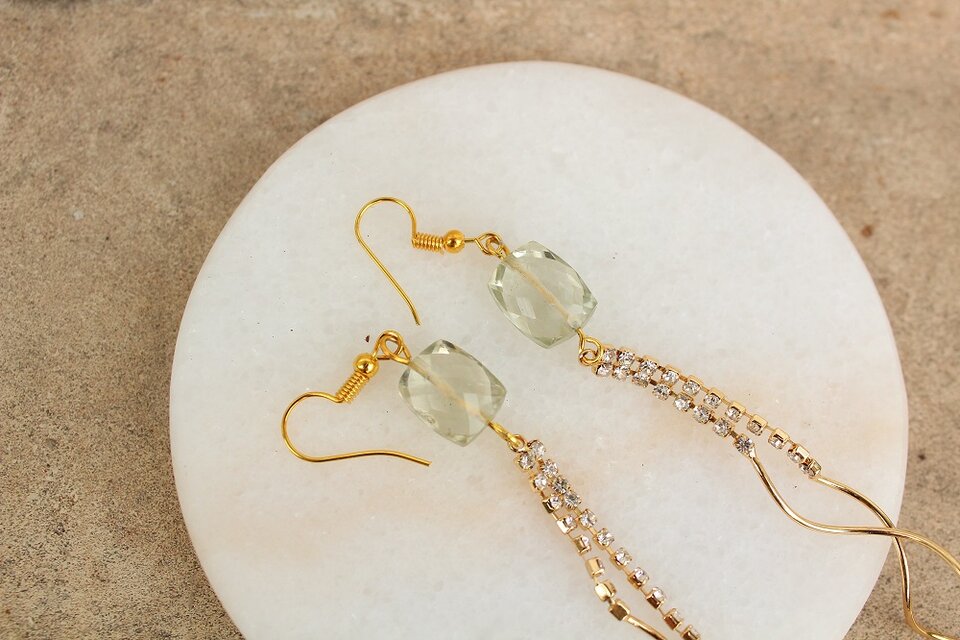 ラインストーンの入ったゴールドのロングパーツに、カッティングの美しいプラシオライトをセットしました。