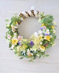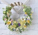 リース素材:アーティフィシャルフラワ-(造花):マーガレット・すみれ・桜・ミモザ・デージー・小花・ユーカリなど。自然素材:ソラカーネーション(ピンク・オレンジ)。その他:オーガンジーリボン飾り(取り外しできません)など。