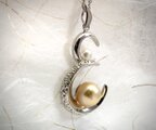クレーター部分が新しくなり、より魅力的になりました。3つの三日月(バチカン部も入れて)が縦に並んだデザインの大ぶりなペンダント。白蝶真珠の金色と淡水真珠の白色がSVの鏡面に反射して優しい光が広がります。三つ編みロープのチェーンとの相性もいいですね。