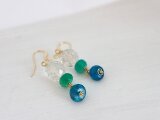 透明なヴィンテージガラスビーズで透明感を、カルセドニーで緑を、そしてアパタイトで青を集めたピアスです。中々に大粒ビーズですので、存在感たっぷりです。