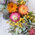 花材:ミモザ、ヘリクリサム、ニゲラ、ルリダマアザミ、シャイニーホワイト、アジサイ