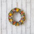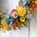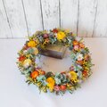 イタリア直輸入のミモザとヘリクリサムを合わせ、春爛漫のリースを作りました。メインのヘリクリサムは、ピンク・黄色の他に…ニュアンスカラーの花も入れ賑やかで元気いっぱいです。ブルーのアジサイとの相性も良く、春らしい明るく爽やかな雰囲気に仕上がりました。所々に入れたミニバラは、自宅でドライフラワーに仕上げた物です。綺麗な色に仕上り、リースにピッタリのカラーです。
