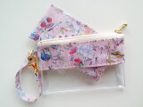 リバティの人気生地、(ビニールコーティングつや無)、 ワイルドフラワーズ Wild Flowers(ピンク)で開けなくても中身が見える便利なポケット仕切り入り、クリアポーチ(カードサイズ)を作りました。