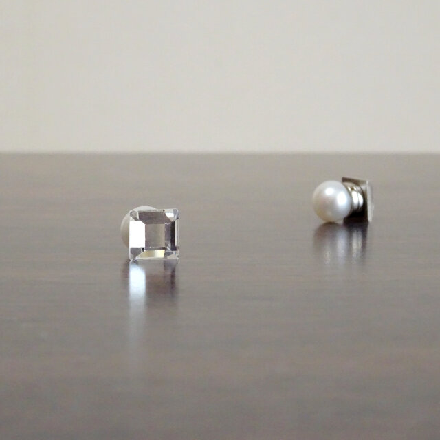 クリアな四角いアドバンストクリスタルと上質な淡水パールを用いた、リバーシブルのマグネットピアスです。