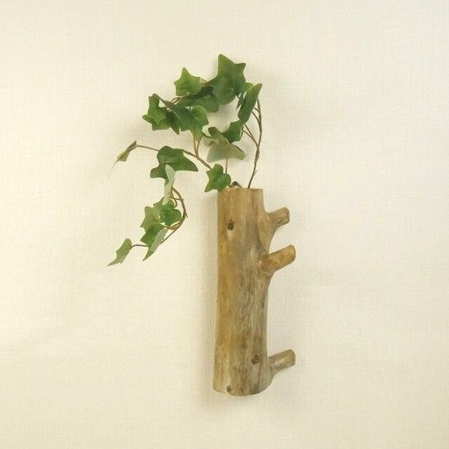 幹に穴を掘り、吊り金具を取り付け、壁掛け式の花器に仕上げました。