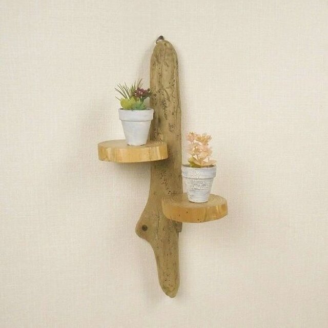 年輪が美しい小さなミニ丸太流木2つを、特徴ある流木に取り付けた吊り式ラックです。
